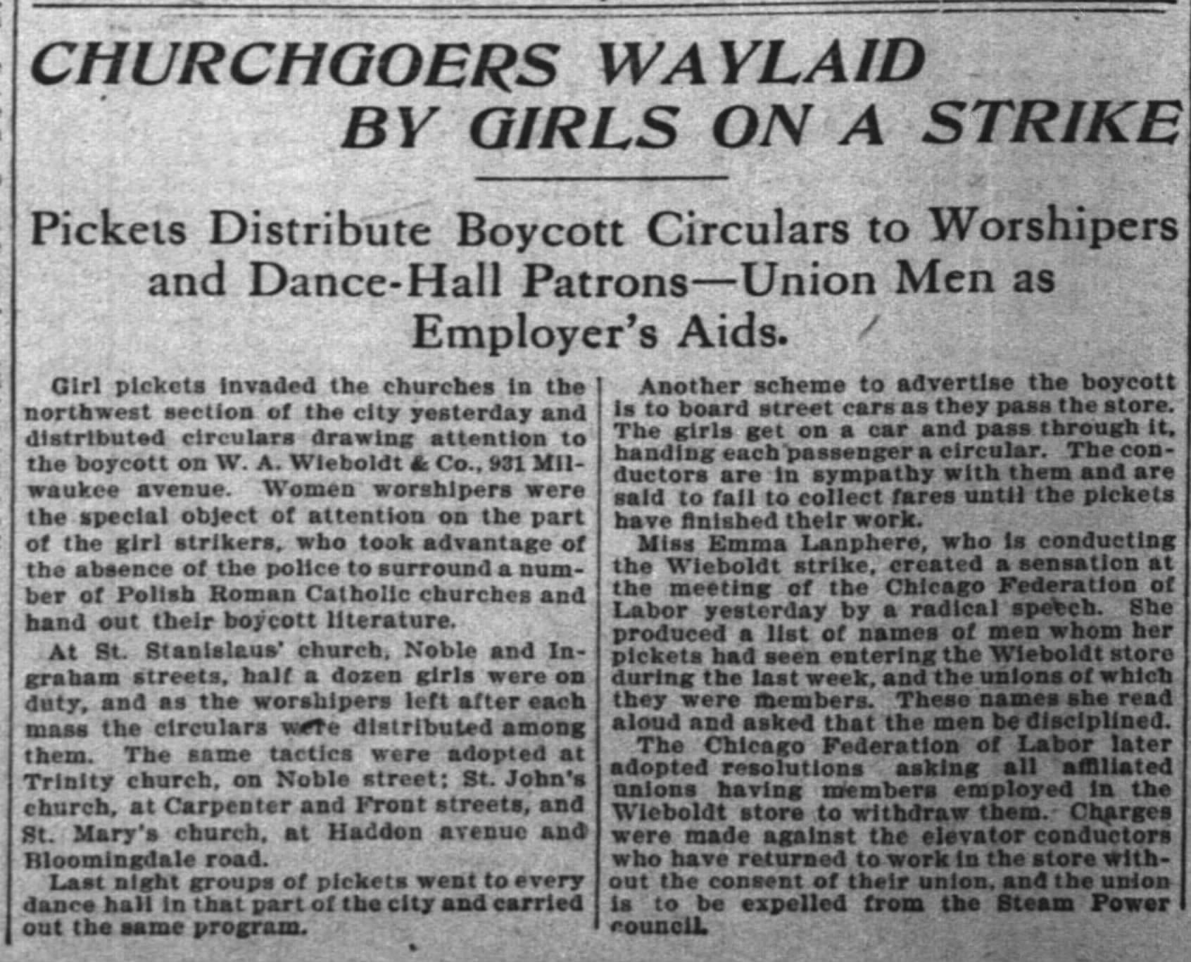 A growing retail empire with a powerful boss in a Chicago with a deep, bold, and highly organized labor movement—it will not surprise you to hear that there was conflict between workers and management here, in particular a months-long strike lead by Retail Clerks' National Protective Association organizer Emma Lanphere in 1904. Wieboldt’s had actually signed an initial contract with the union in 1902 without a strike after the union struck the Moeller Bros. department store across the street. With the RCNPA growing from 16,000 to 60,000 members between 1900 and 1904, for the next contract the union came back asking for better working conditions, fewer working hours, and a day of rest on Sundays. Wieboldt’s refused. The ensuing strike from Lanphere and the clerks union included boycotts, organizing at churches, and—most powerfully—sympathy strikes, with aligned teamsters refusing to deliver to the department store (labor movement solidarity sufficiently threatened the power of rich assholes that the federal government outlawed sympathy strikes in 1947 with the Taft-Hartley Act).