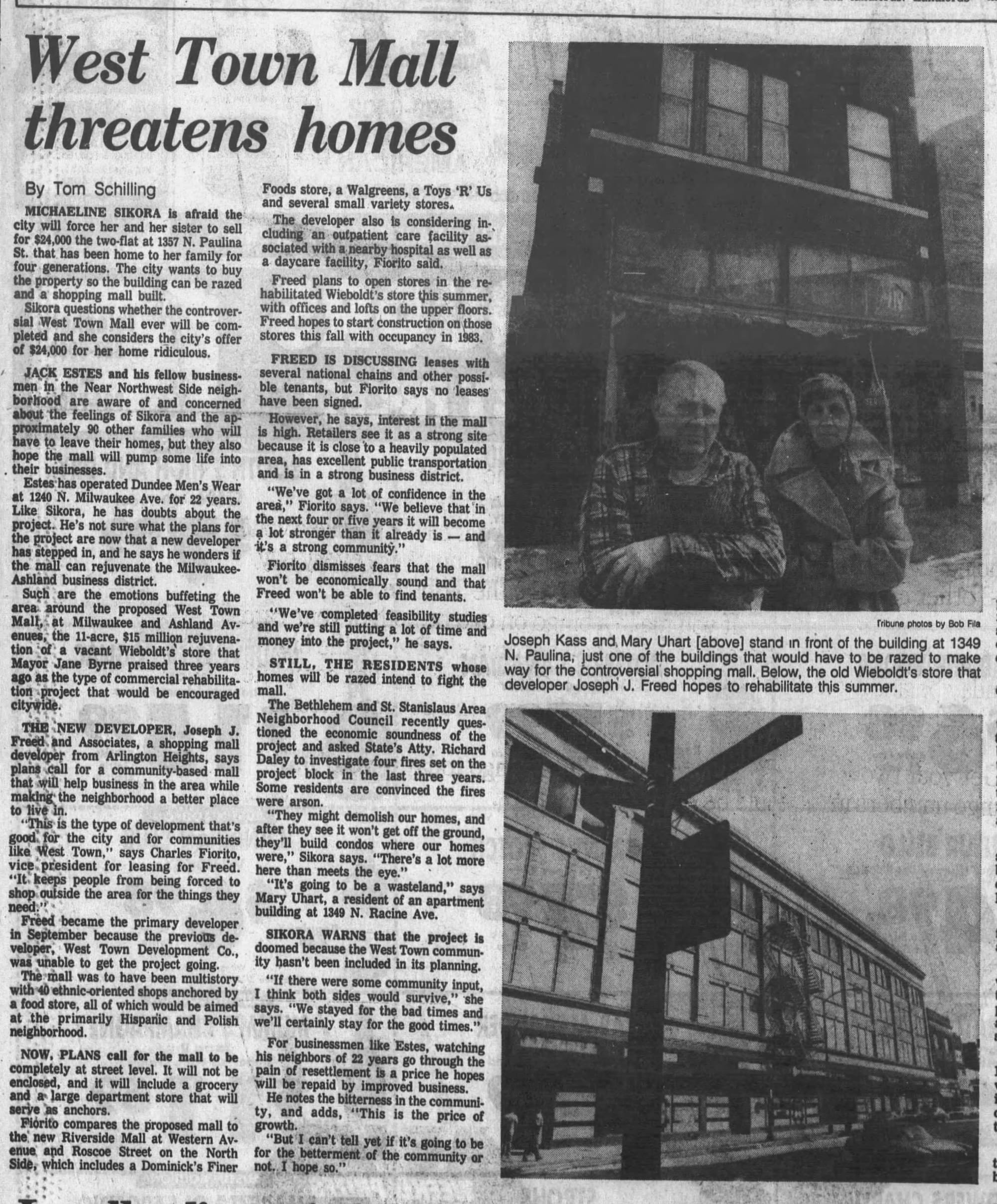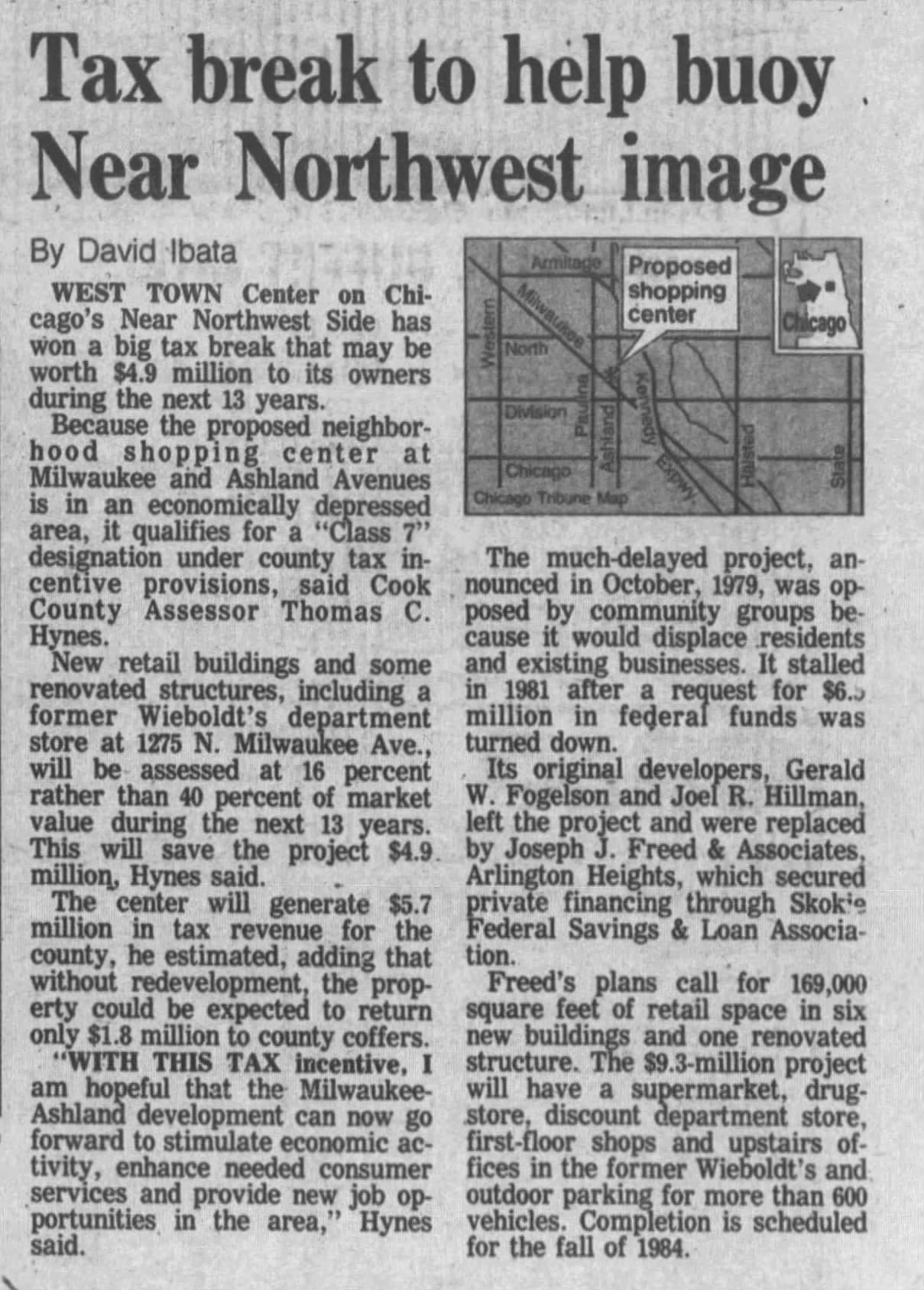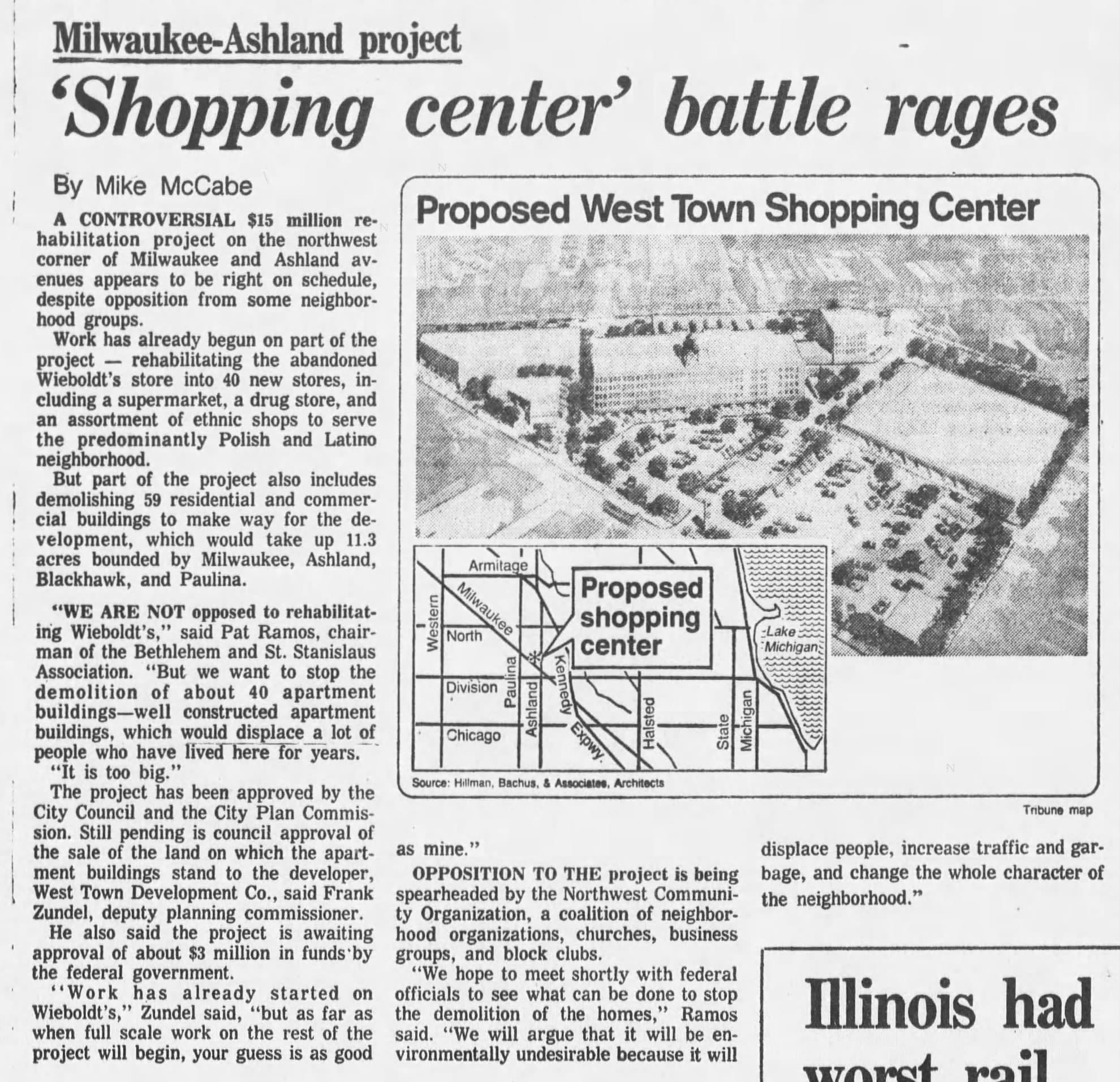 Equipped with the minimal tools they had, the residents fought the West Town Center project and the City of Chicago as loudly as they could. Vociferous opposition scared off the original developer, and potentially helped influence a grant application rejection by the Economic Development Administration, which denied the developer’s application because they forecast adverse local economic impact from the project. Still, armed with the money from HUD, $5m in tax breaks from Cook County ($16m in 2025 dollars), and supported by the Chicago Department of Planning, City and Community Development, the project—funded by Skokie Federal Bank and developed by Joseph J. Freed & Associates of Arlington Heights—went ahead. Owners of the condemned homes received market value for their properties, which in the early 1980s landed between $20k and $30k—the equivalent of $80k to $100k today.